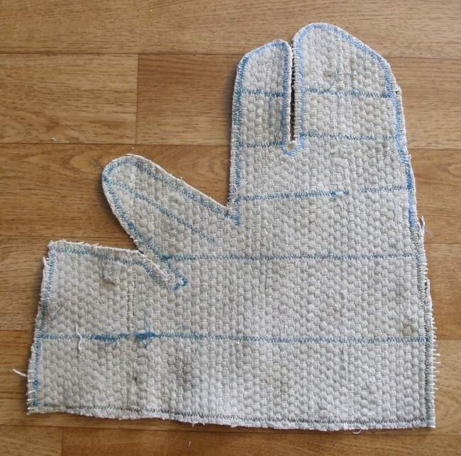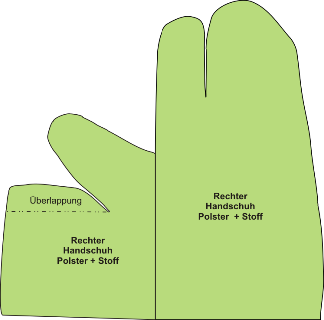 Der Beispiel-Handschuh im Bild ist noch auf die alte Weise aus einem Schweißerhandschuh genäht, was nicht zu empfehlen ist.