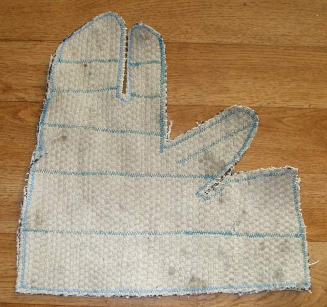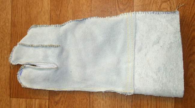 Der Beispiel-Handschuh im Bild ist noch auf die alte Weise aus einem Schweißerhandschuh genäht, was nicht zu empfehlen ist.