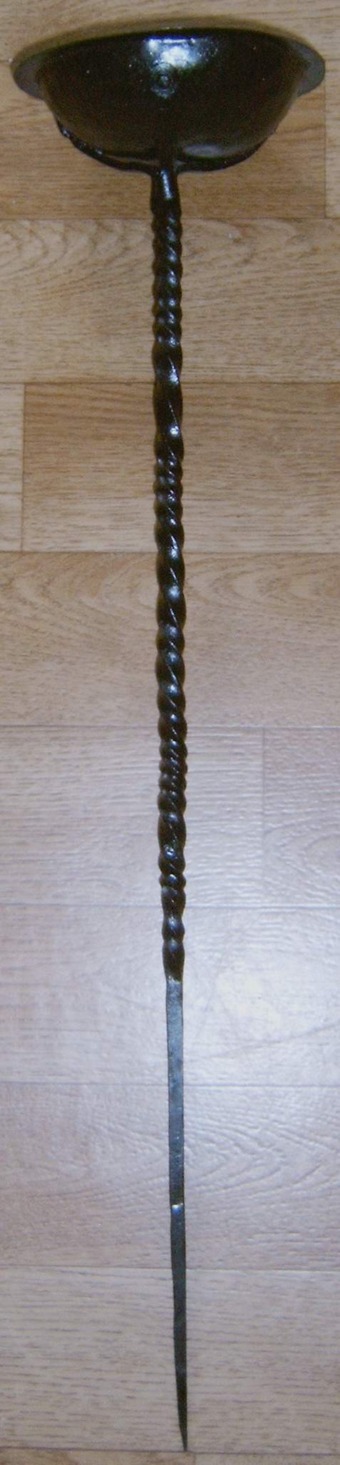 × Lampe Eine einfache Öl-/Wachslampe, verwendbar mit Docht oder Kohlestück und Wachs, Öl oder Tran. Mit tordierter Stil und angenieteter Schale. Die Lampe als Ganzes Material: Eisen Höhe: 551 mm Druchmesser: 122 mm Dicke: 10 mm Lampendetail Nachweis Quelle: Cagner,Ewert u.a: „Die Wikinger“, Burkhard-Verlag Ernst Heyer Essen, 1968, Auflage 1975. S.184 Abb. 1 mittelalter/lampe2.txt Zuletzt geändert: 2025-05-14 09:05von 127.0.0.1 Anmelden