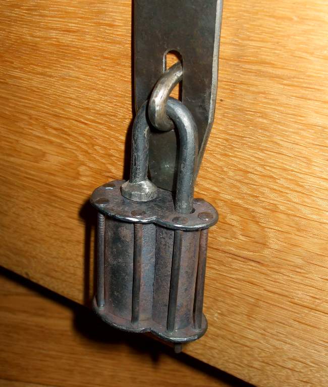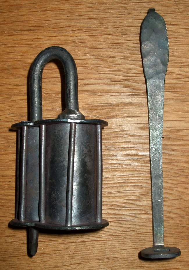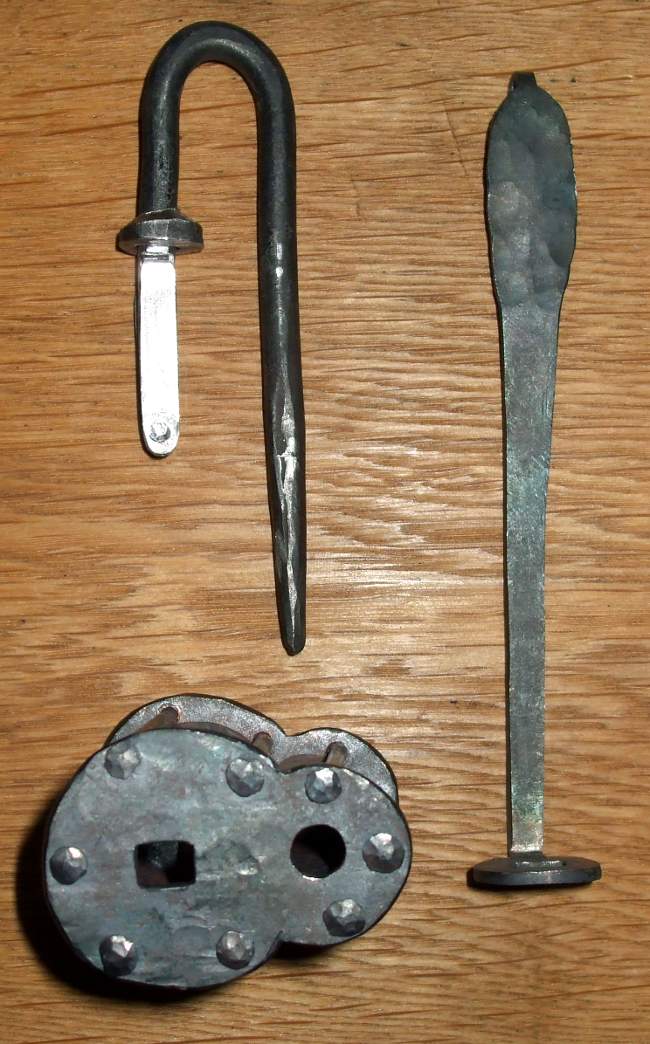 × Vorhängeschloss Wikingerzeitliches genietetes Vorhängeschloss mit schlichtem Schlüssel. Das Schloss (3,8 x 4,8 x 10,2 cm) mit Schlüssel (12,7 x 1,8 cm) Material: Eisen, Stahl Gewicht: 133 g Das Schloss in geöffnetem Zustand An der Truhe Zu den Scharnieren Nachweis folgt … mittelalter/schloss09_f.txt Zuletzt geändert: 2025-05-14 09:05von 127.0.0.1 Anmelden